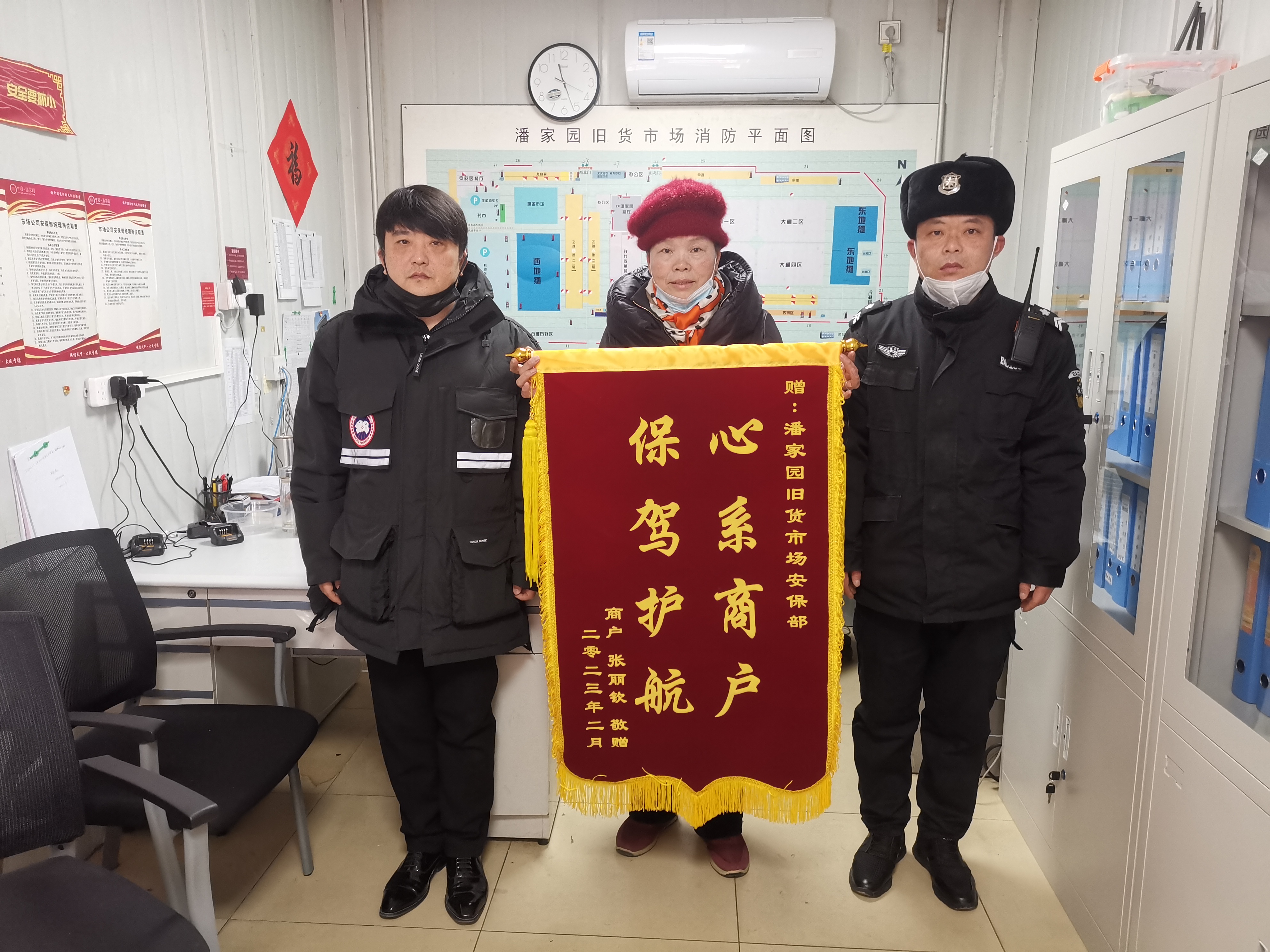 2月3日,潘家园旧货市场商户为公司驻该市场保安队送来一面写有“心系商户 保驾护航”的锦旗表示感谢。