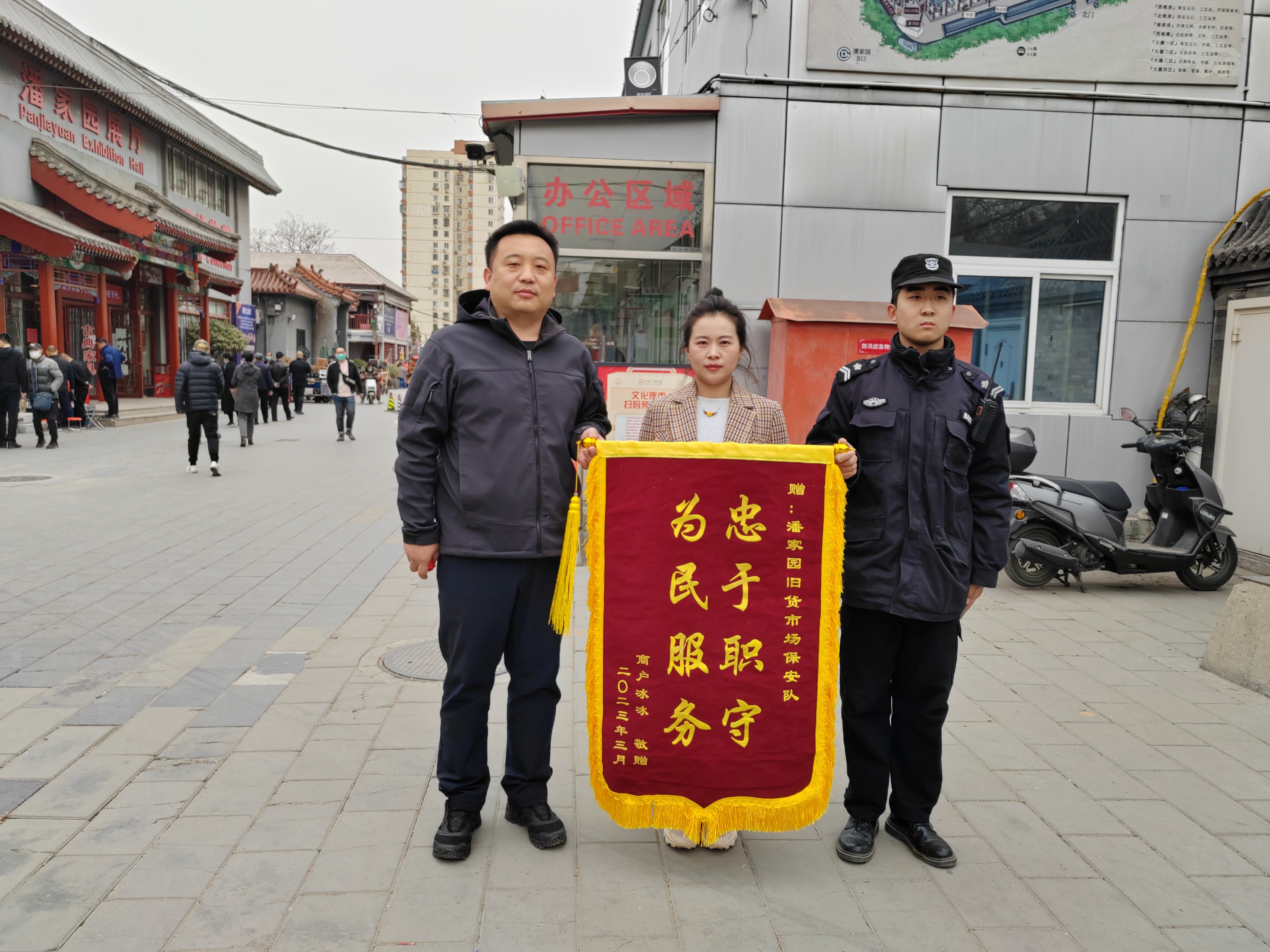 3月8日19时许,公司驻潘家园旧货市场保安队接到一区商户寻求帮助,称其拉杆箱放在垃圾桶附近丢失了。收到消息后,保安队队长吕瑞轩第一时间通过监控帮助商户查找,最终发现是被捡废品的人员捡走后,便沿着该人的行走路线寻找。最终,确定了一段较为清晰的监控录像,吕队长便将其分别转发给每个出入口的执勤队员,并部署队员一旦发现该人立即上报。3月9日18时许,西北门值班队员马登科发现此人,经过细致沟通,帮商户寻回拉杆箱。