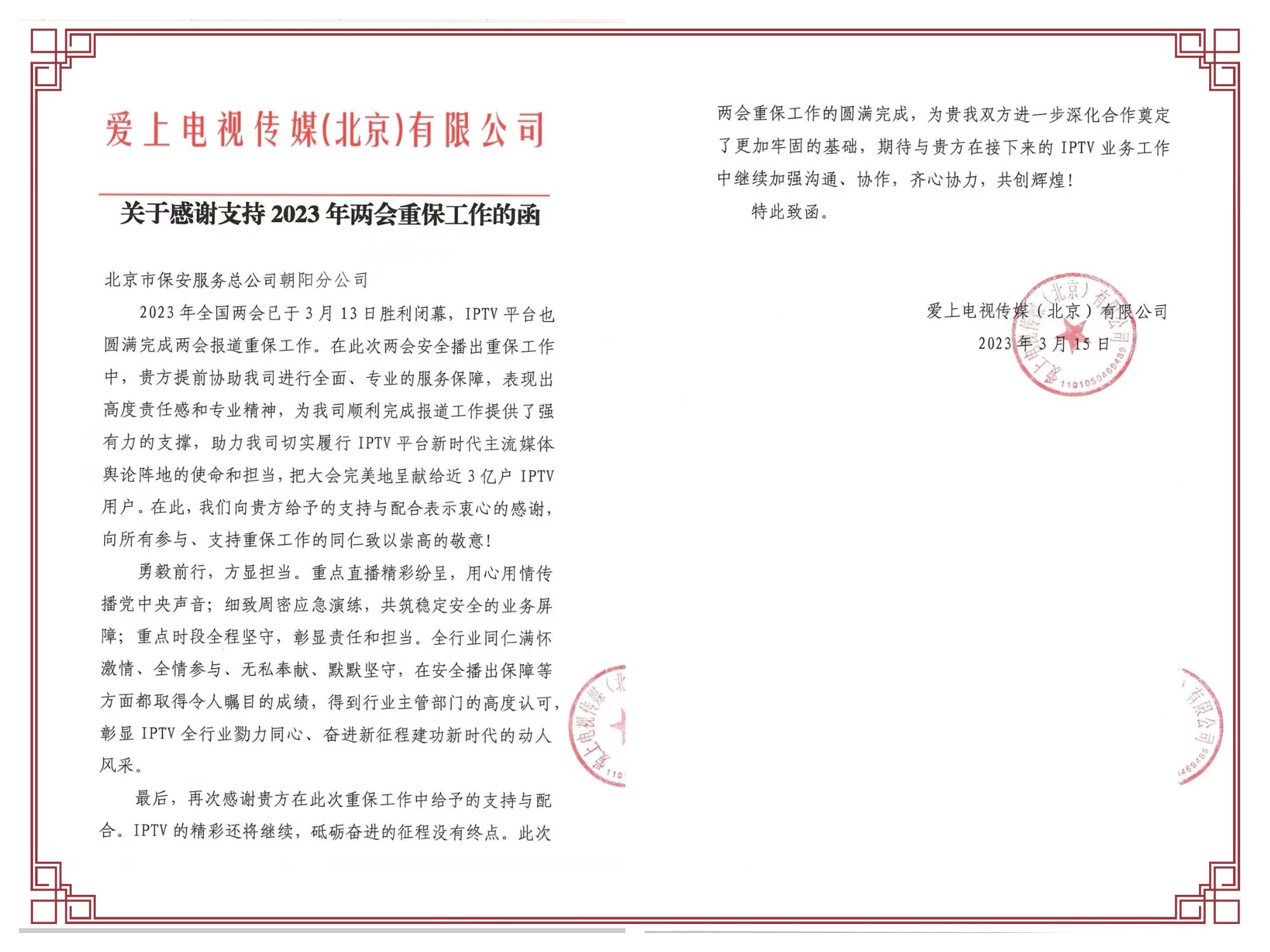 2023 年全国两会已于3月13日胜利闲幕,IPTV 平台也圆满完成两会报道重保工作。在此次两会安全播出重保工作中,我公司协助爱上传媒有限公司进行全面、专业的服务保障,表现出高度责任感和专业精神,为其顺利完成报道工作提供了强有力的支撑。为此,爱上传媒向我公司给予的支持与配合送上感谢信表示衷心的感谢,向所有参与、支持重保工作的同仁致以崇高的敬意!