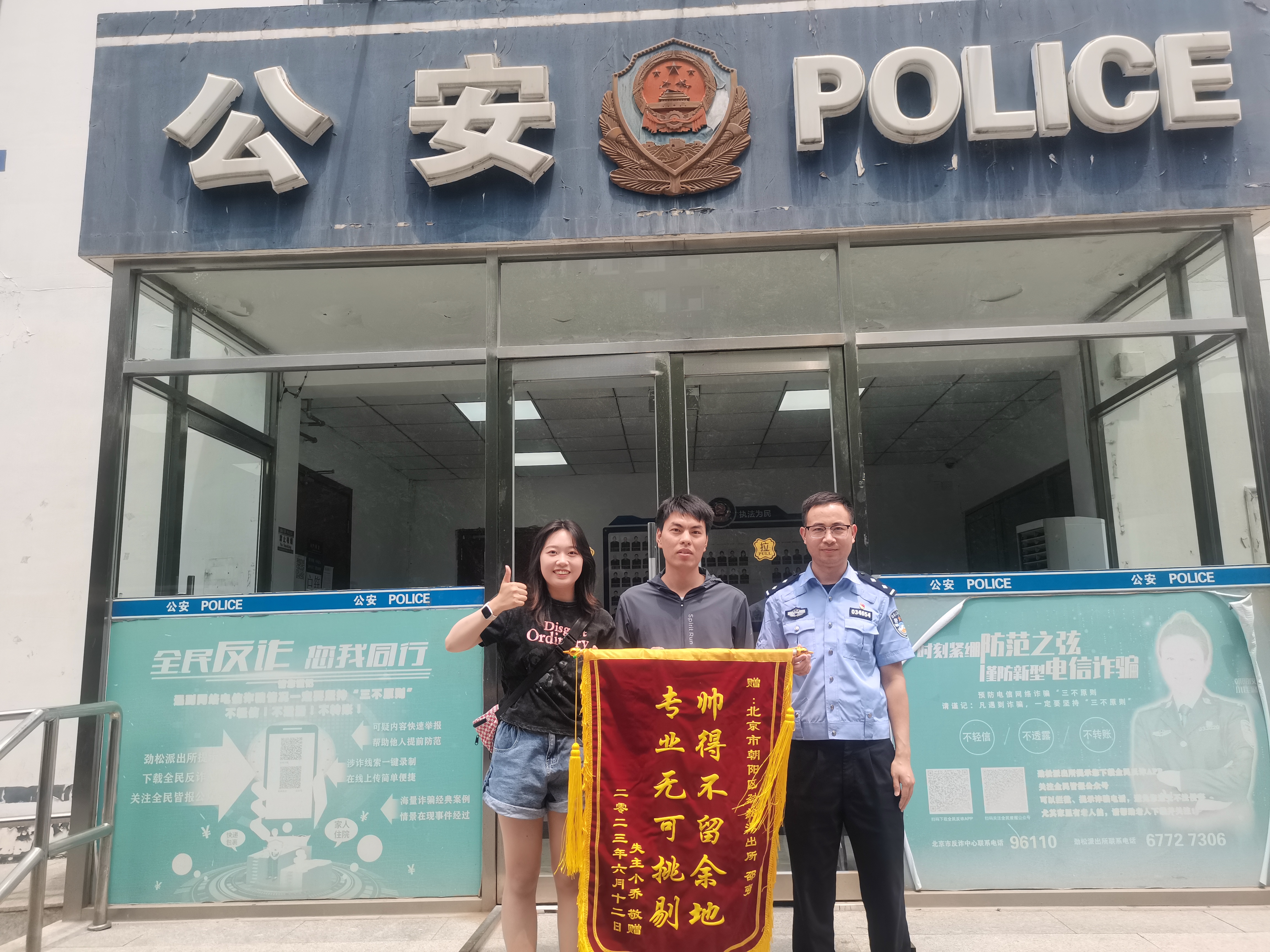 驻劲松派出所辅警队员邵强履职尽责,耐心细致帮助群众成功找回丢失手机,收到了一面写有“帅得不留余地,专业无可挑剔”的锦旗。原来,6月12日22时,事主乔女士报警求助,其存有客户信息等重要资料的手机不慎遗失,希望能帮忙找回。邵强按照派出所民警指示接待了乔女士,他一边安抚一边耐心询问乔女士途径路线、乘坐车辆等详细信息,后调取了相关监控视频,由于深夜光线不佳,且灯光反光,始终无法看清其乘坐车辆的车牌,但邵强没有放弃,紧盯车牌,历时30余分钟的反复查看最终明确了车牌信息,第一时间上报民警。后经民警工作,成功联系到司机找回了丢失的手机,并将其成功归还给失主乔女士。为表达谢意,乔女士专程到派出所赠送锦旗。