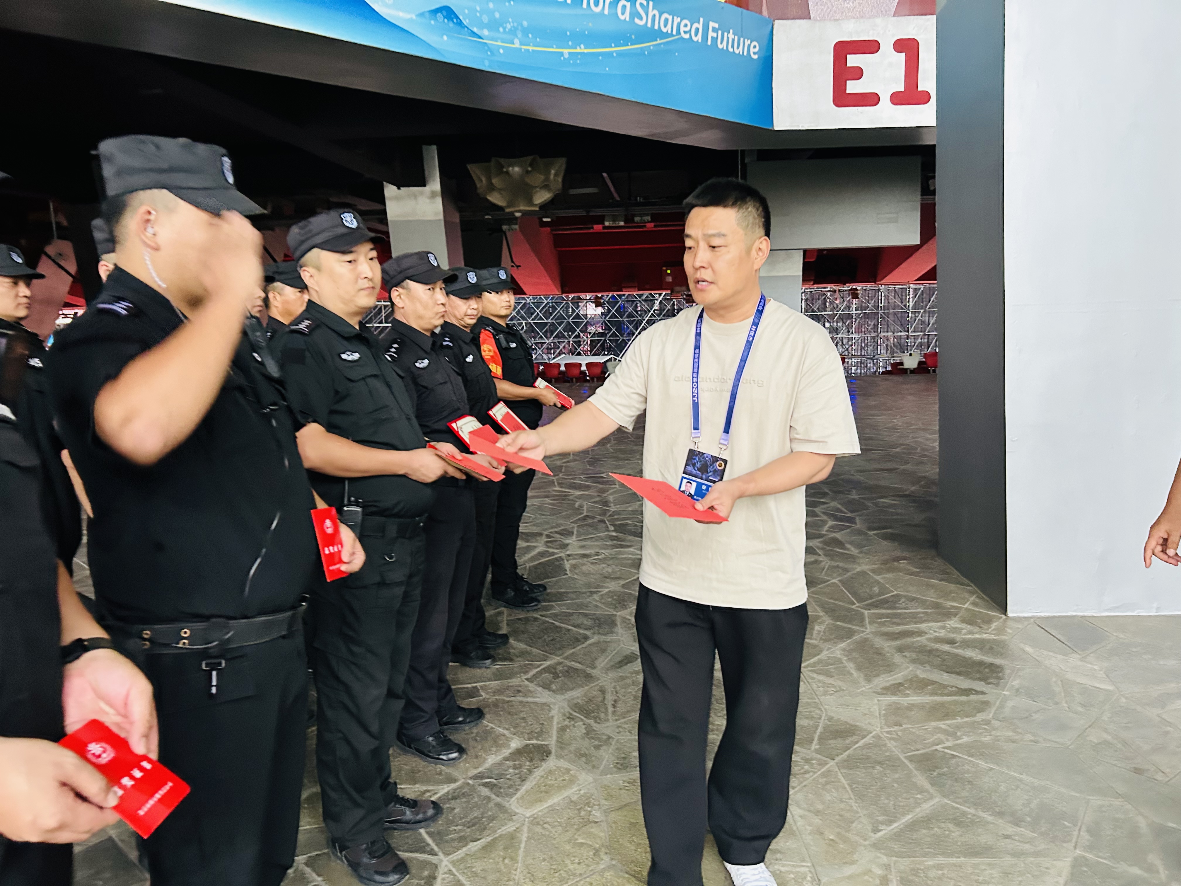 9月23日下午,总公司企管部领导及公司经理陈志刚在“鸟巢”演唱会安保勤务现场,一同为荣获功奖的个人送奖到岗。