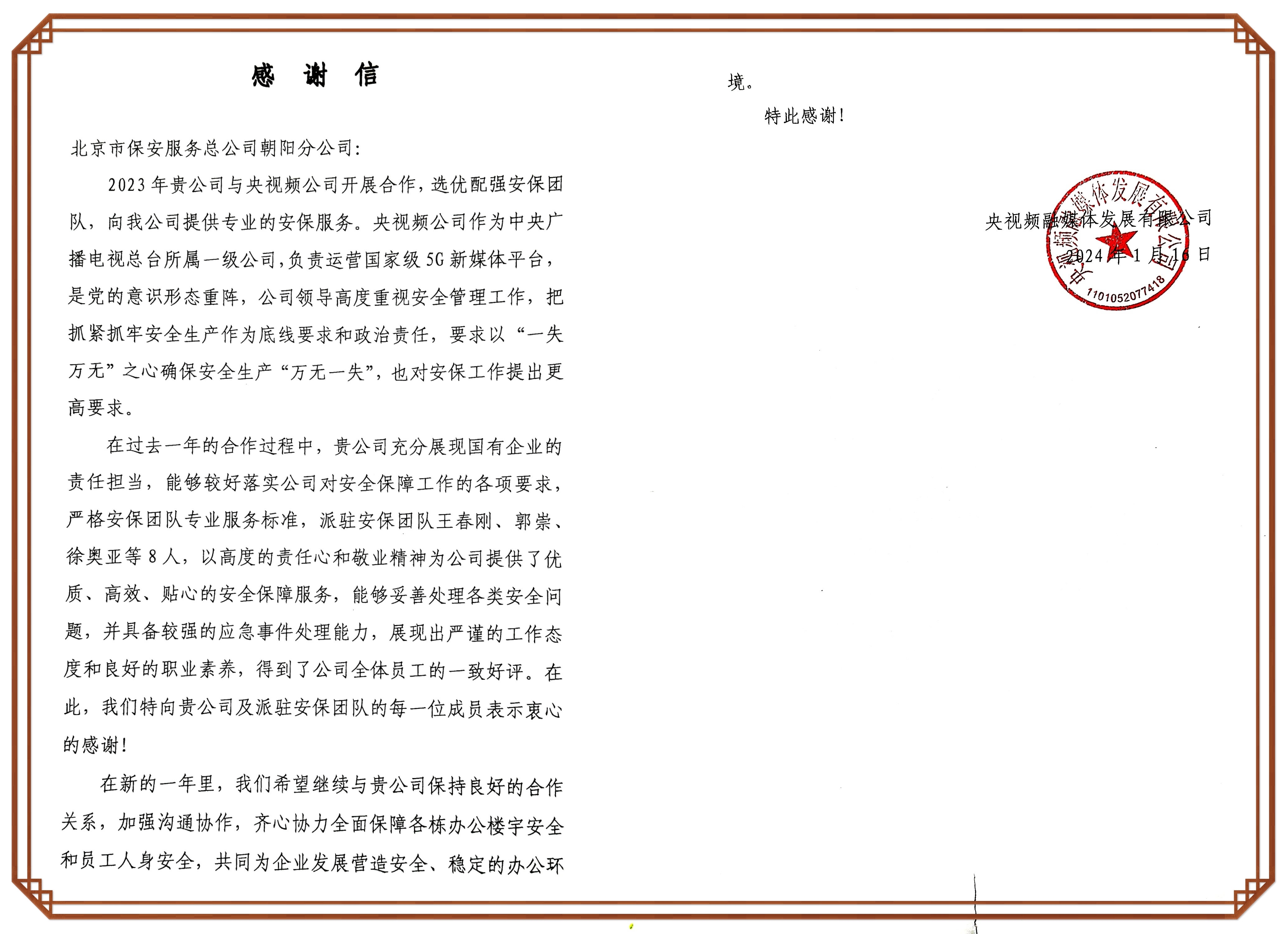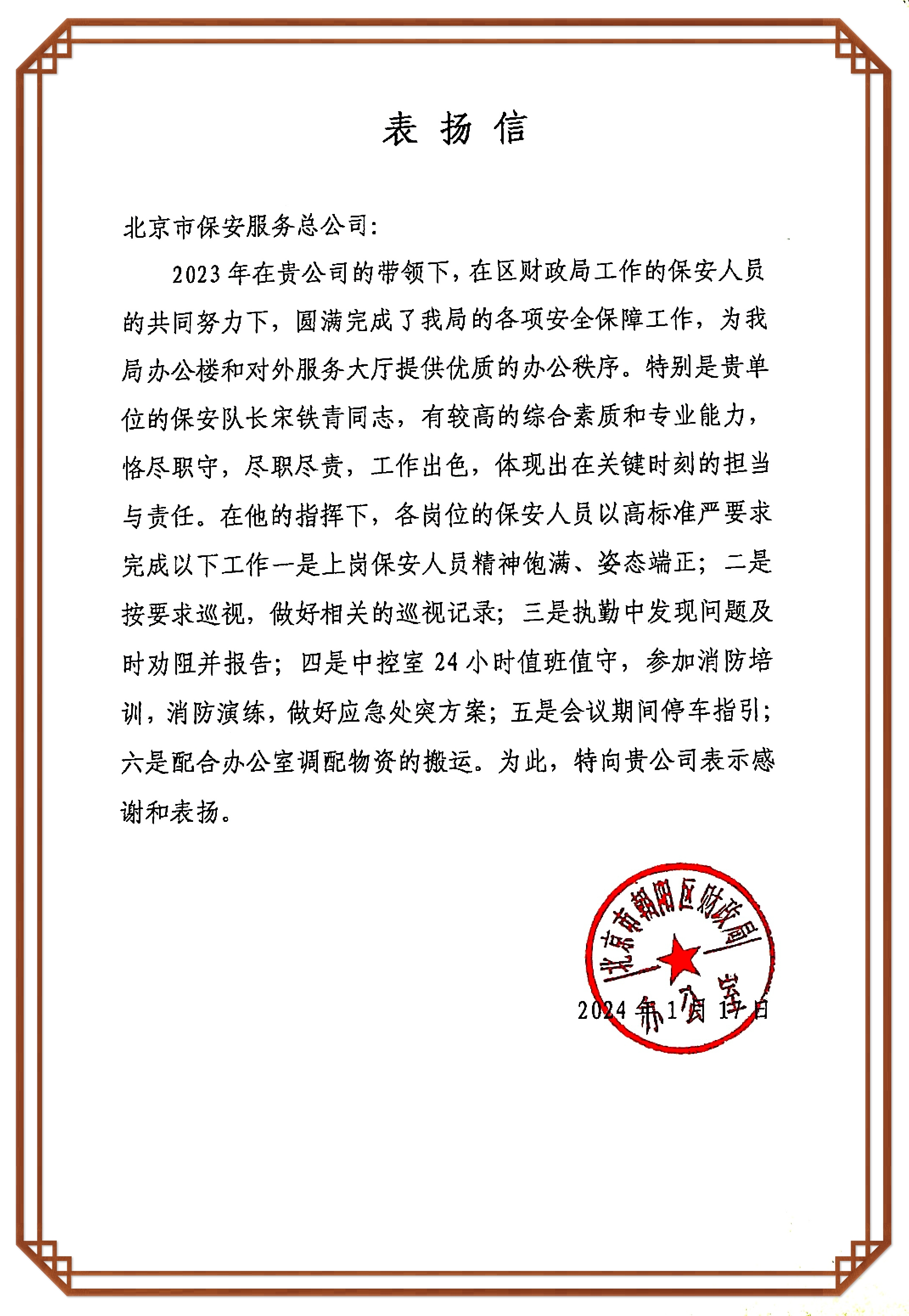 近日,公司陆续收到多家客户单位送来的锦旗、感谢信和表扬信,信中对我公司所展现的国有企业的责任担当、派驻保安的专业素质和提供的优质服务给予高度赞扬,对保安队负责人及保安员在工作中体现的高度责任心、严谨的工作态度、良好的职业素养和敬业精神给予充分肯定。