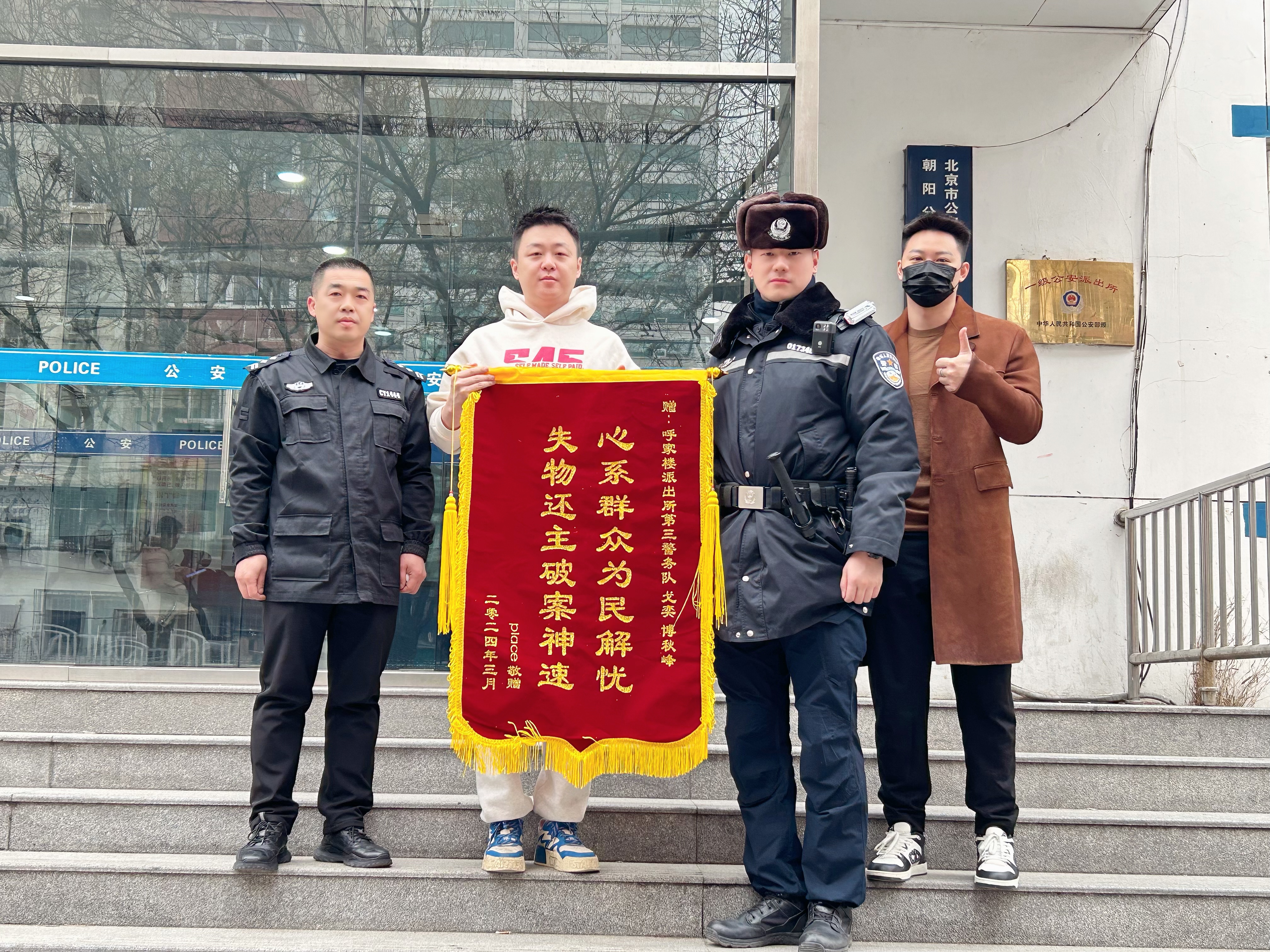 迅速破案,心系群众显担当。3月12日,公司驻呼家楼派出所协勤中队收到一面写着“心系群众为民解忧 失物还主破案神速”的锦旗。原来,2月26日15时许,世贸天阶南街一酒吧老板报警,称一顾客于2月24日到酒吧喝酒直至25日凌晨2点多准备回家时,发现自己的黑色蒙口牌羽绒服(价值1万余元)不见了,内有一个iPhone耳机(价值1700元)。接到报警后,公司驻呼家楼派出所协勤队长傅秋峰和队员王瑶配合民警立即赶赴案发现场,调取监控录像,发现一身高175CM左右,戴眼镜,着黑色羽绒服的可疑男子匆匆离开酒吧。经仔细核对,发现该男子穿的黑色羽绒服与事主描述丢失的那款极为相似。傅秋峰和队员王瑶立即通过外围监控进行追踪,经过连日来的不懈努力,最终确定了嫌疑人的居住地。于3月5日8时许,傅队和队员王瑶协助民警在嫌疑人居住地将其抓获。嫌疑人已被依法治安拘留。