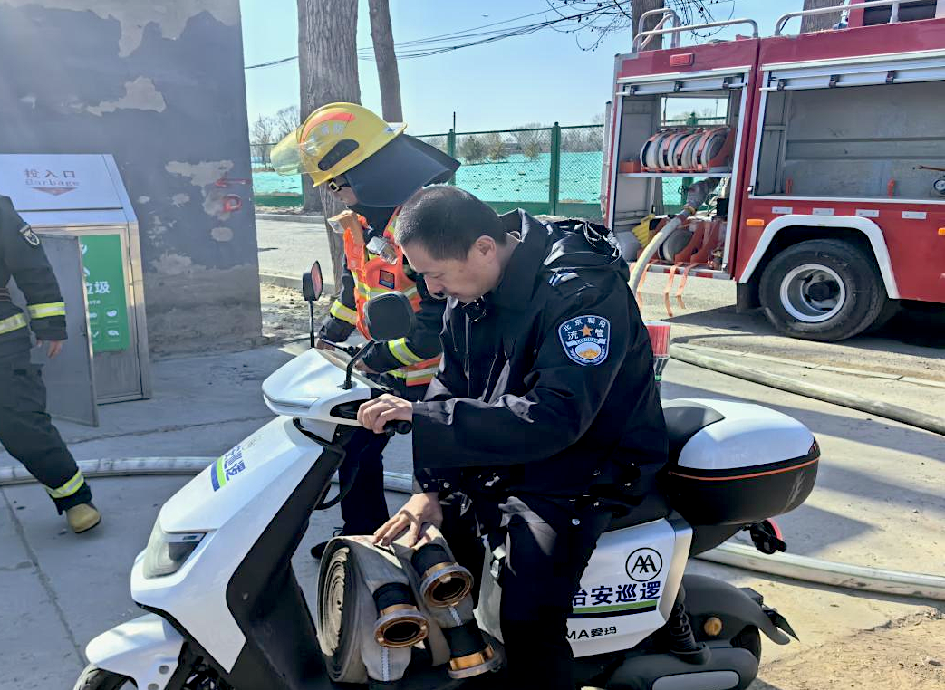 见民警及消防队到达现场,杨光迅速向其说明情况并协助消防员灭火。期间,由于道路狭窄,消防车无法进入,需要使用延长带。杨光见状,用治安巡逻车帮消防员运送延长带,提高救援速度。