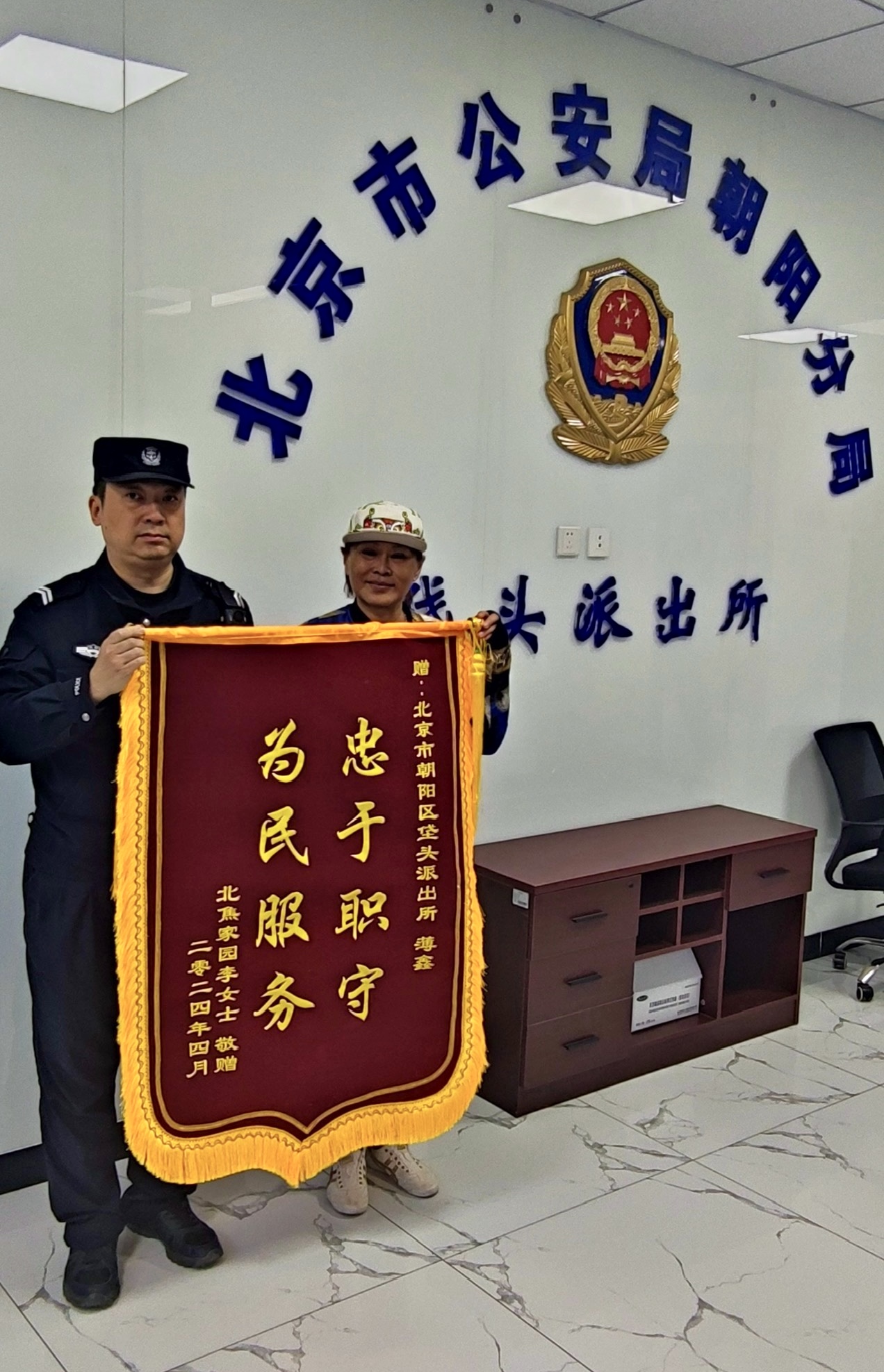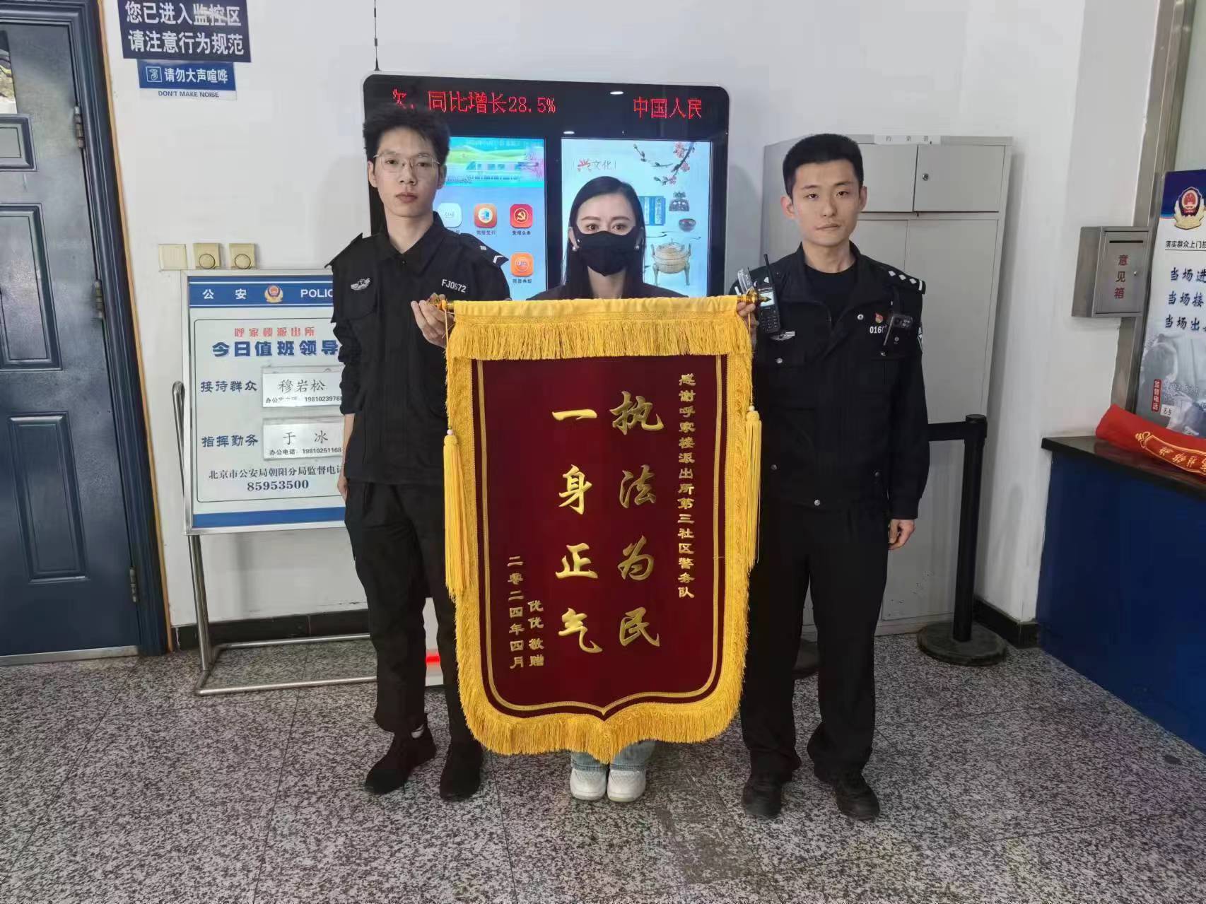 抓捕盗贼显身手,伸张正义受表扬。4月17日,优优女士专程到公司驻呼家楼派出所协勤队,送来一面写有“执法为民 一身正气”的锦旗,对协勤队员抓捕盗贼的付出表示感谢。