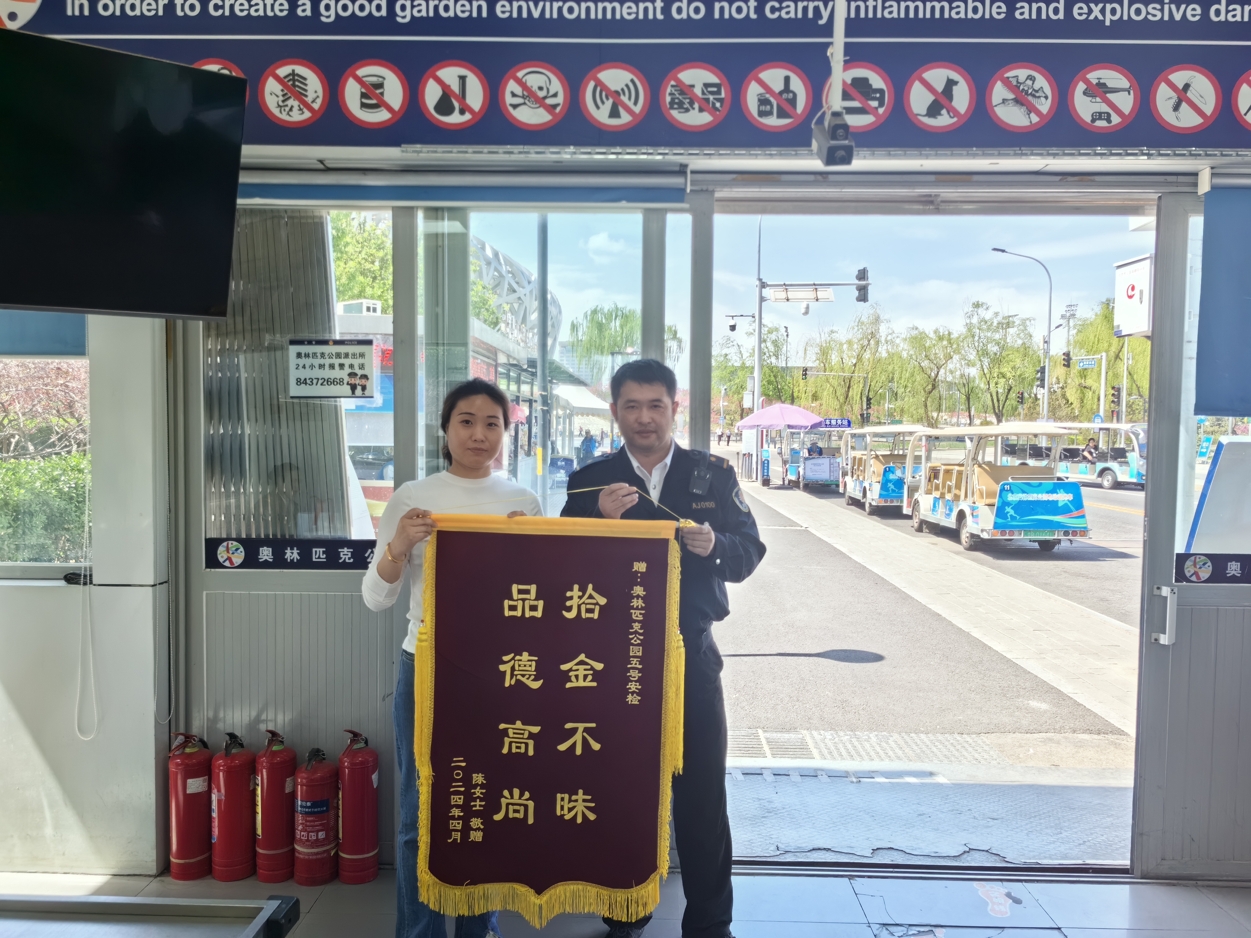 拾金不昧展风采,诚实守信树榜样。4月18日,陈女士为公司驻奥林匹克公园安检队员唐睿送来写有“拾金不昧,品德高尚”的锦旗,对他拾金不昧的行为表示感谢。