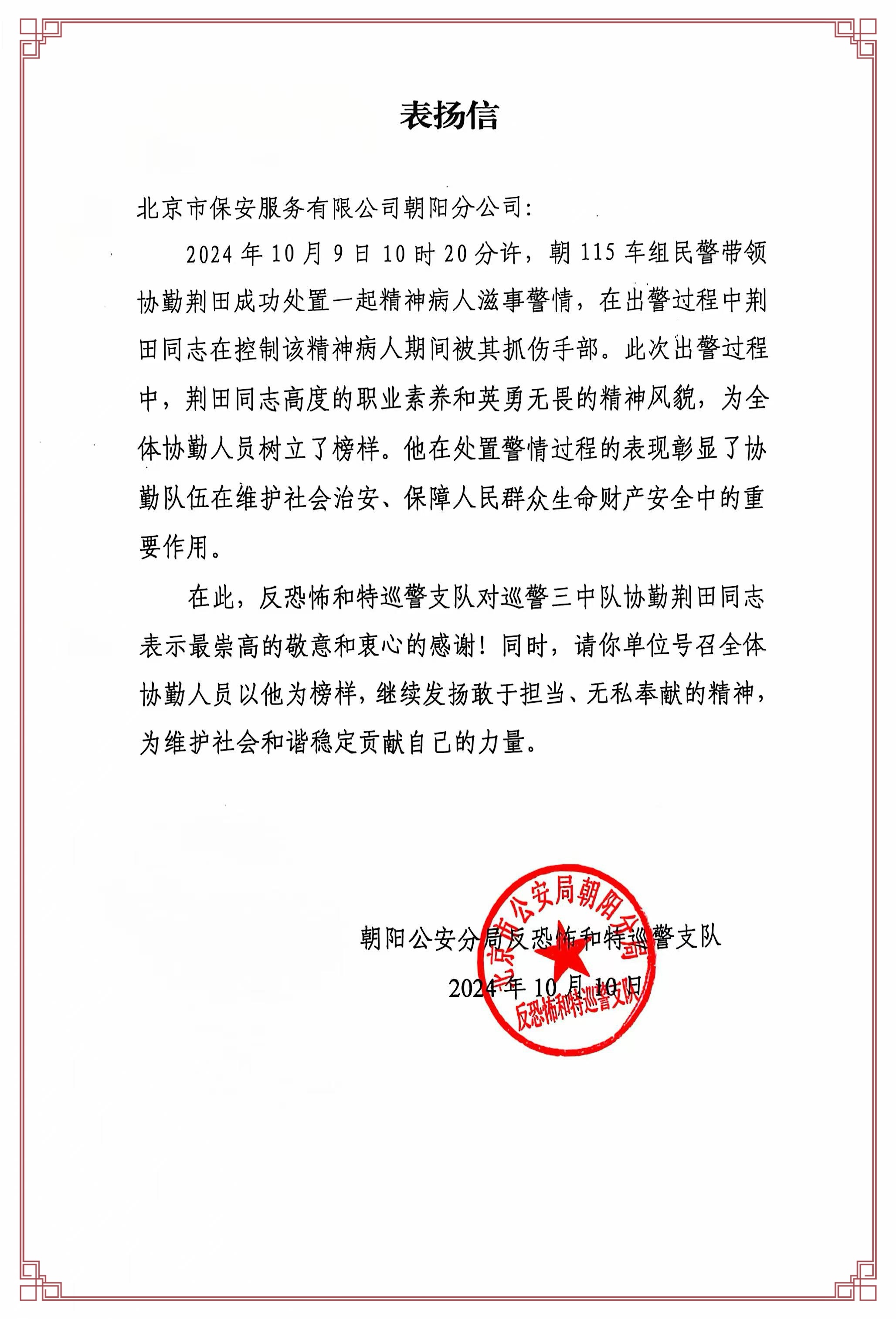 近日,公司收到一封来自客户单位朝阳公安分局反恐怖和特巡警支队的表扬信。信中对公司协勤队员配合民警在成功处置一起精神病人滋事警情中表现出的高度职业素养和英勇无畏精神风貌给予高度赞扬和充分肯定。