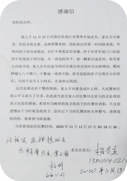 原来,在11月12日放学期间,事主杨先生家的孩子不慎在学校附近的停车场内走失,杨先生四处寻找无果后,拨打110进行求助。劲松派出所接到报警后,第一时间联系杨先生,并将杨先生带回所内给予安抚,并细心询问孩子的体貌特征及准确走失地点。辅警覃云露根据杨先生提供的相关信息展开分析研判,很快在停车场门口的监控中发现了孩子的踪迹,准确掌握了孩子的体貌特征后,根据孩子的动向,翻看沿街监控。劲松辖区地形复杂,且有些路口监控设备并不完善,孩子行动轨迹成断点式,为加速找到孩子,覃云露与杨先生合作,覃云露查找监控并通过电话为杨先生提供方向,杨先生则实地进行查找。在排查了七八个路口十六七个监控设备后,锁定了孩子的活动区域,杨先生根据覃云露提供的方向,最终成功找到了孩子。因一时高兴没有记下排查监控视频人的名字,便特意写了一封感谢信寄到了派出所。