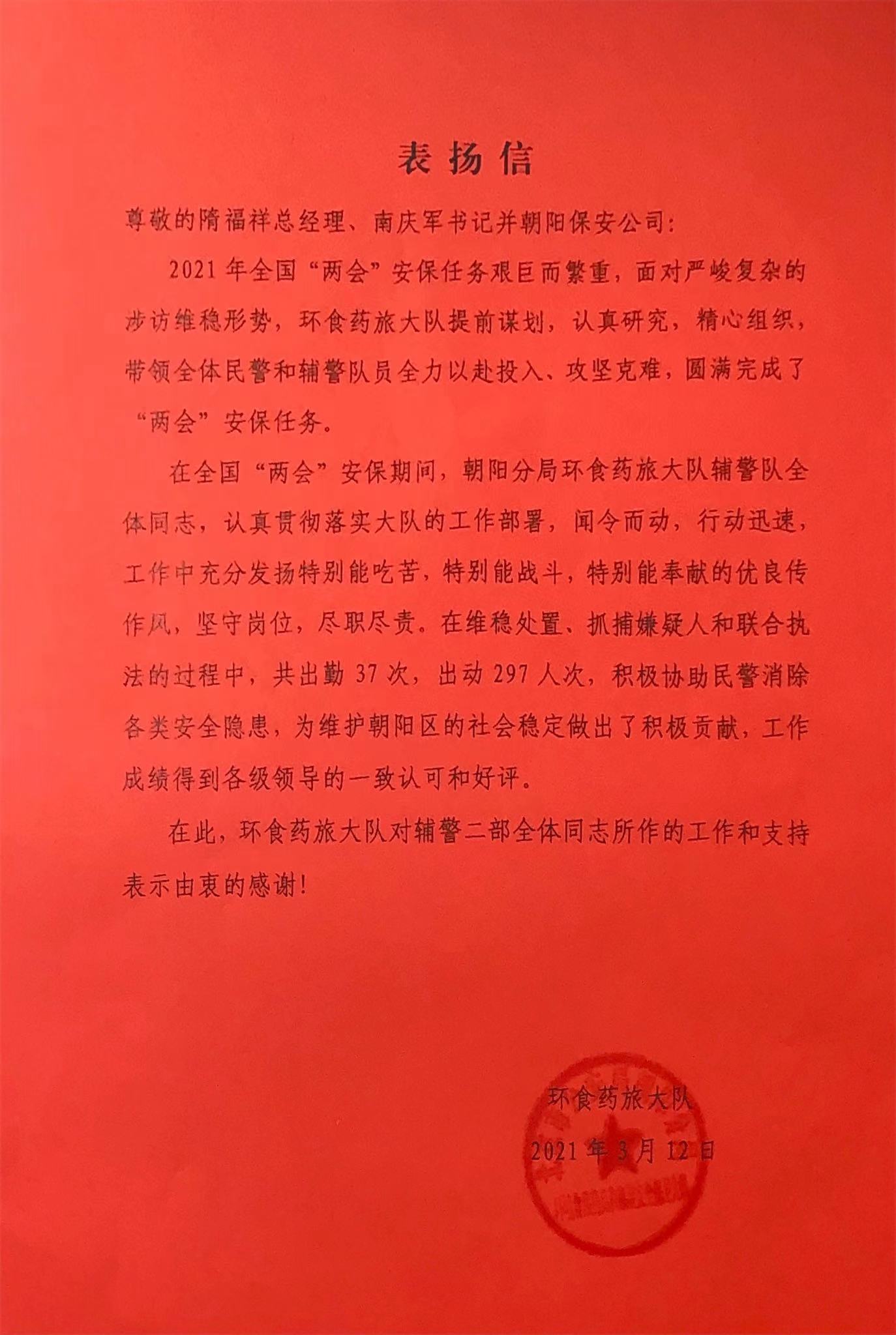 近日,公司收到分局环食药旅大队的一封表扬信,信中表扬我公司派驻的辅警队在全国“两会”召开期间,认真贯彻落实各项工作部署,闻令而动,行动迅速,工作中充分发扬朝阳辅警优良传统作风,坚守岗位,尽职尽责。在维稳处置、抓捕嫌疑人和联合执法的过程中,共出动297人次配合民警出勤37次,圆满地完成了全国“两会”期间的维稳安保工作任务,为“两会”的顺利举行营造了安全稳定的社会环境。