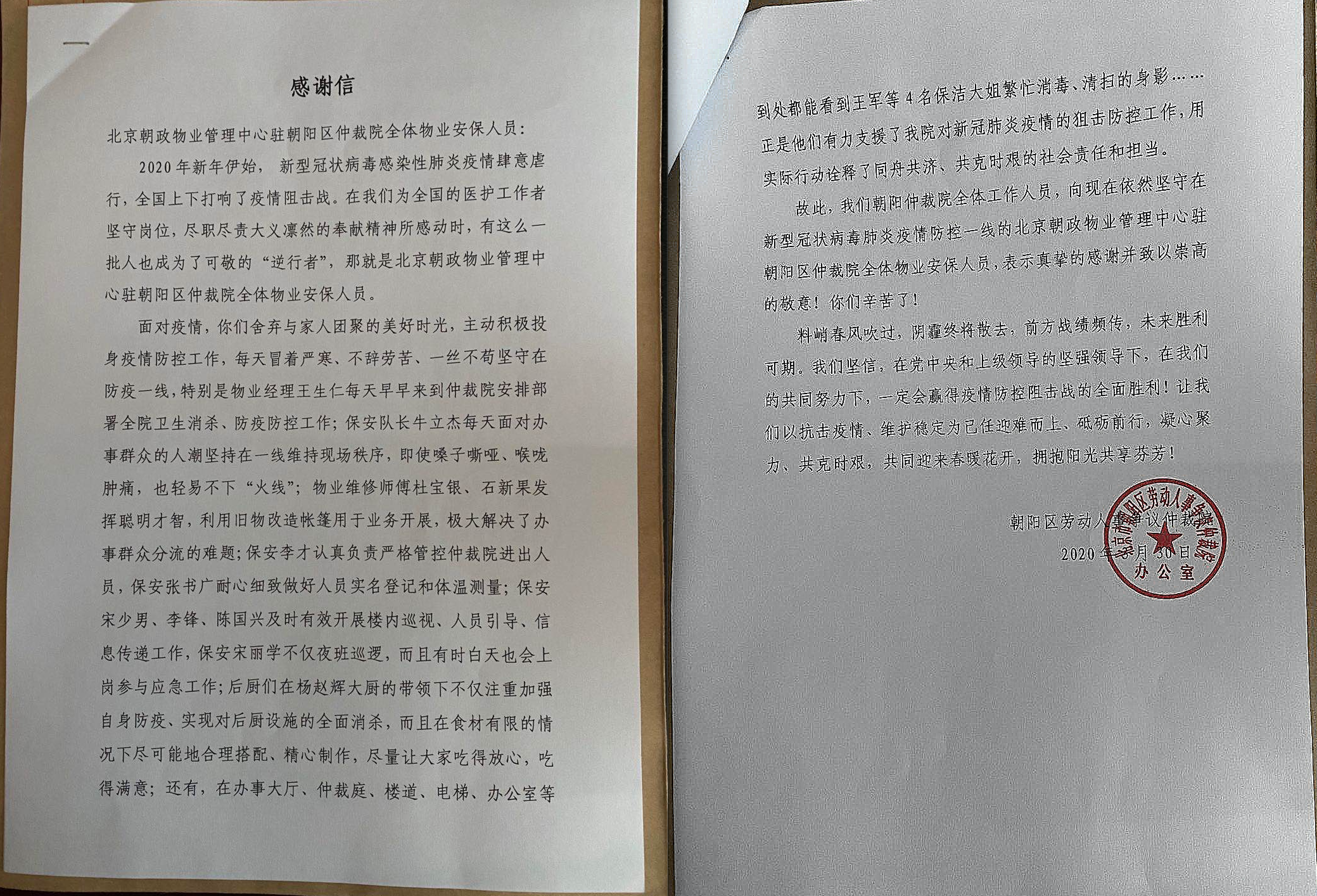 因在疫情期间工作中表现突出,不畏艰辛,任劳任怨。朝阳区人事争议仲裁院为表示感谢及崇高的敬意,向我公司保安员写了一封感谢信。感谢信内容如下:
