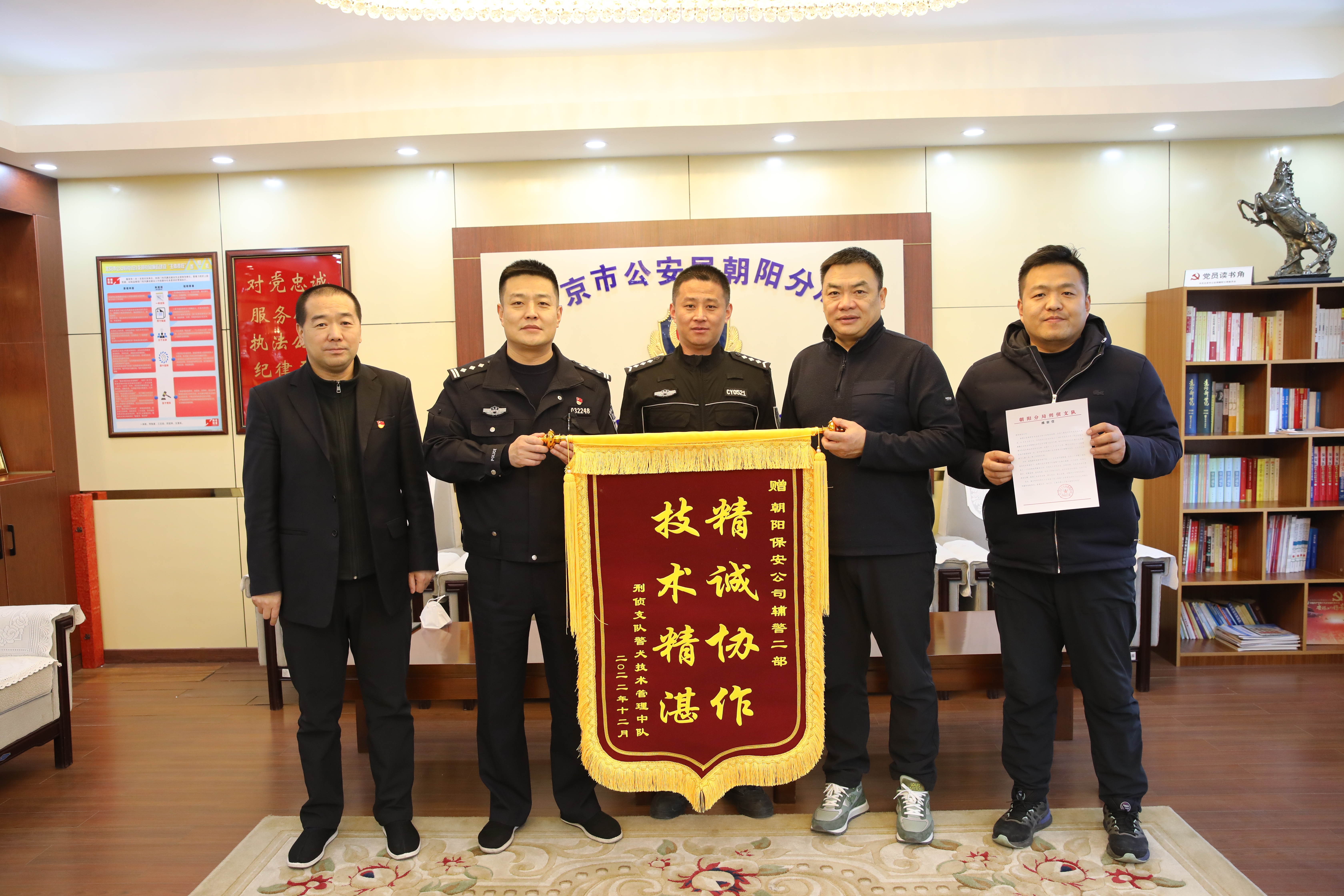 1月6日,客户单位刑侦支队专程到公司送来锦旗和感谢信,对公司派驻的辅警训犬员一直以来的工作给予充分肯定。赞扬警犬中队辅警队事不避难、义不逃责,圆满完成二十大安保等各项勤务工作,栉风沐雨、刻苦训练,尤其是参加2022年北京市职工职业技能大赛警犬训导员竞赛暨北京市公安局警犬技术大赛比赛前后,克服困难、直面挑战,组织人员集中培训,全力以赴打好基础,从容不迫参加比赛,辅警训犬员吴孜航、王克两名同志分别获得个人第一名和第三名的优异成绩。