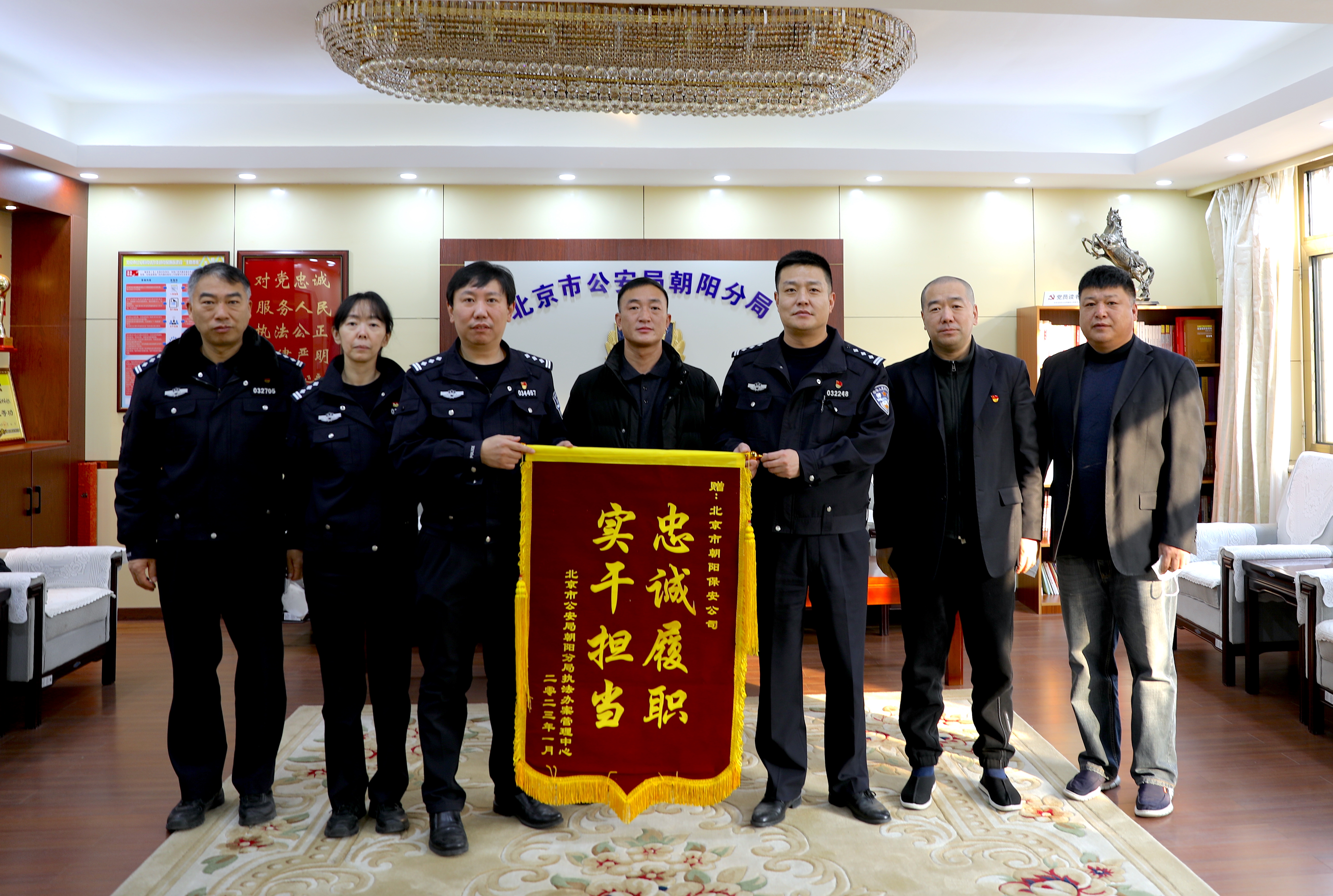 1月12日,客户单位执法办案中心专程到公司送来一面写有“忠诚履职 实干担当”的锦旗,对公司驻执法办案中心辅警队一年以来始终如一的工作状态表示感谢。