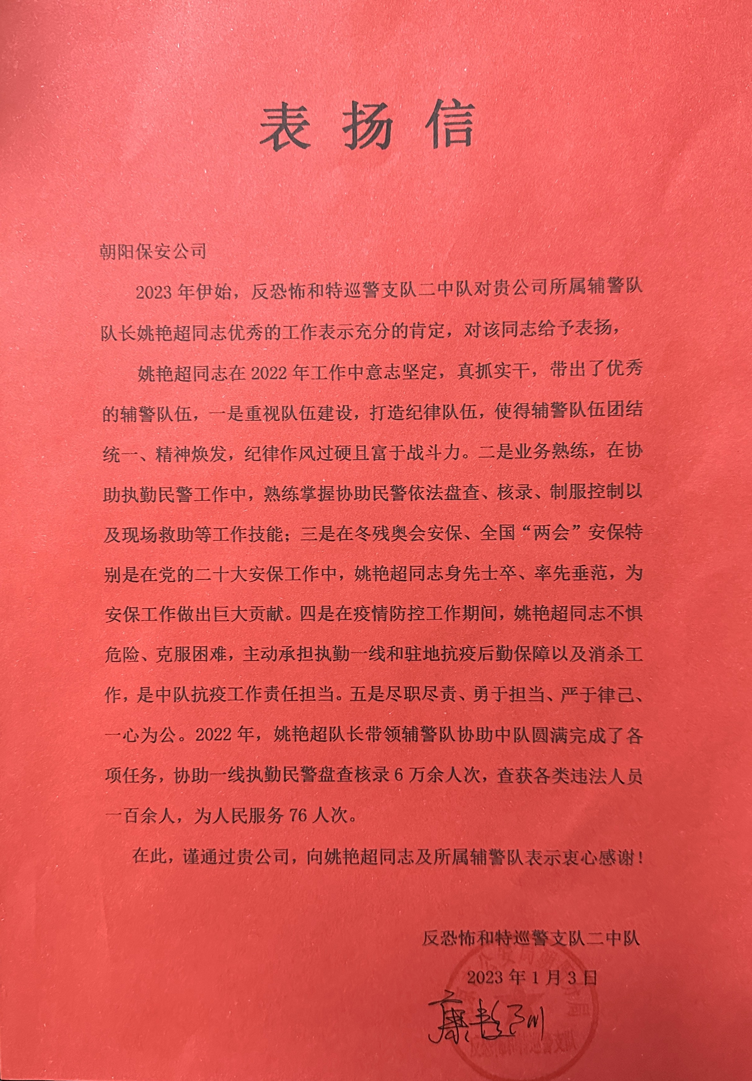 1月3日,公司收到反恐怖和特巡警支队二中队的表扬信。信中对辅警队员姚艳超同志的工作表示充分肯定。表扬该同志在队伍建设、业务工作、重大安保以及疫情防控等方面均尽职尽责、勇于担当、严于律己、一心为公,特此送上表扬信表示衷心感谢。
